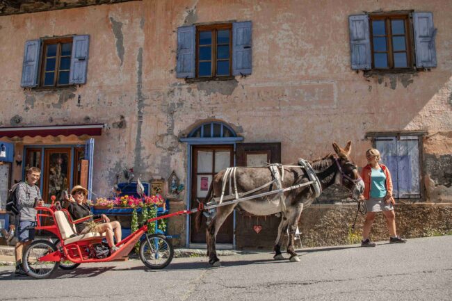 Une personne à l'arrière est aux commandes des freins et de la commande de séparation d'urgence, tandis qu'une autre personne à l'avant guide l'âne en longe. Bref, c'est un formidable outil d'inclusion qui donne accès à tous aux plaisirs de la randonnée dans nos belles vallées du Queyras !